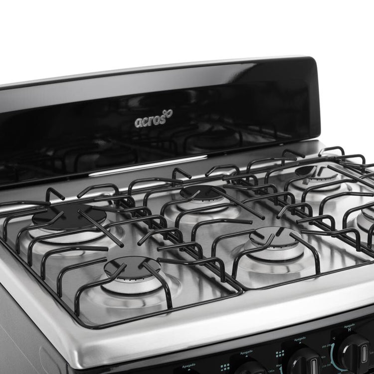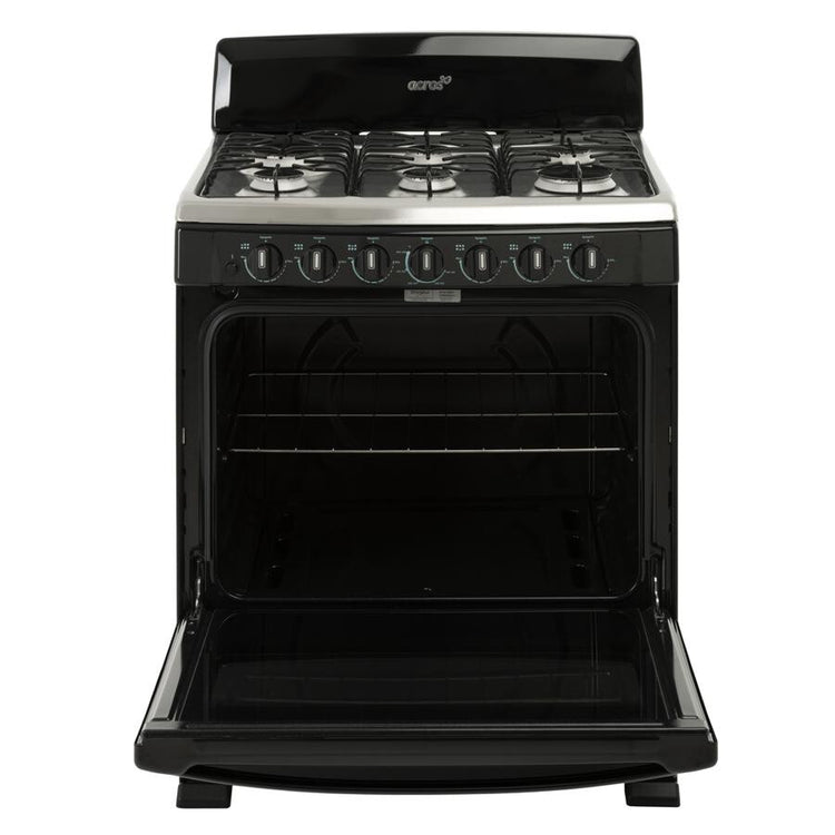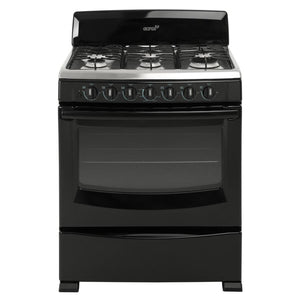 Estufa al piso 30'' en color Negro con cubierta en color Tittanio . Con sus 3 parrillas de alambrón, 6 quemadores de aluminio, cubierta en acero inoxidable totalmente sellada, nuevas perillas muy fáciles de usar y horno de 5.1 p³ con ventana extragrande tienes la estufa ideal para cocinar los platillos favoritos de tu familia.