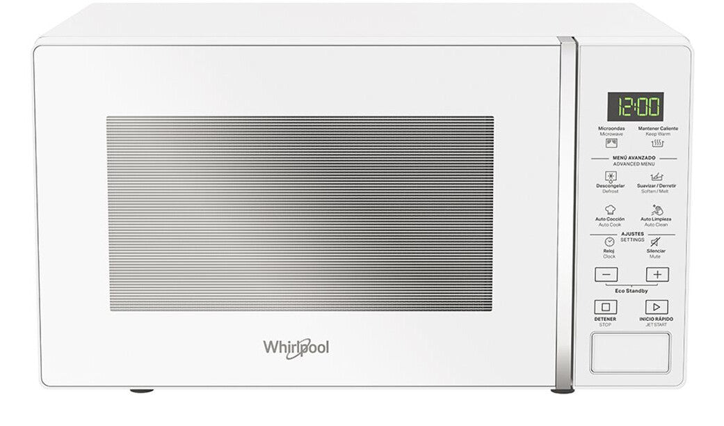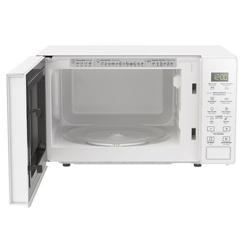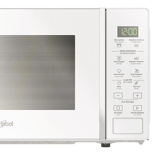 Con 5 niveles de potencia, 4 opciones para descongelar y 12 opciones de autococción. Con función Mantener Caliente, Autolimpieza, Modo Ahorro de Energía. Pantalla y control digital con LED, y plato giratorio.