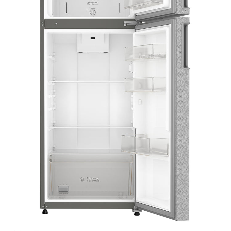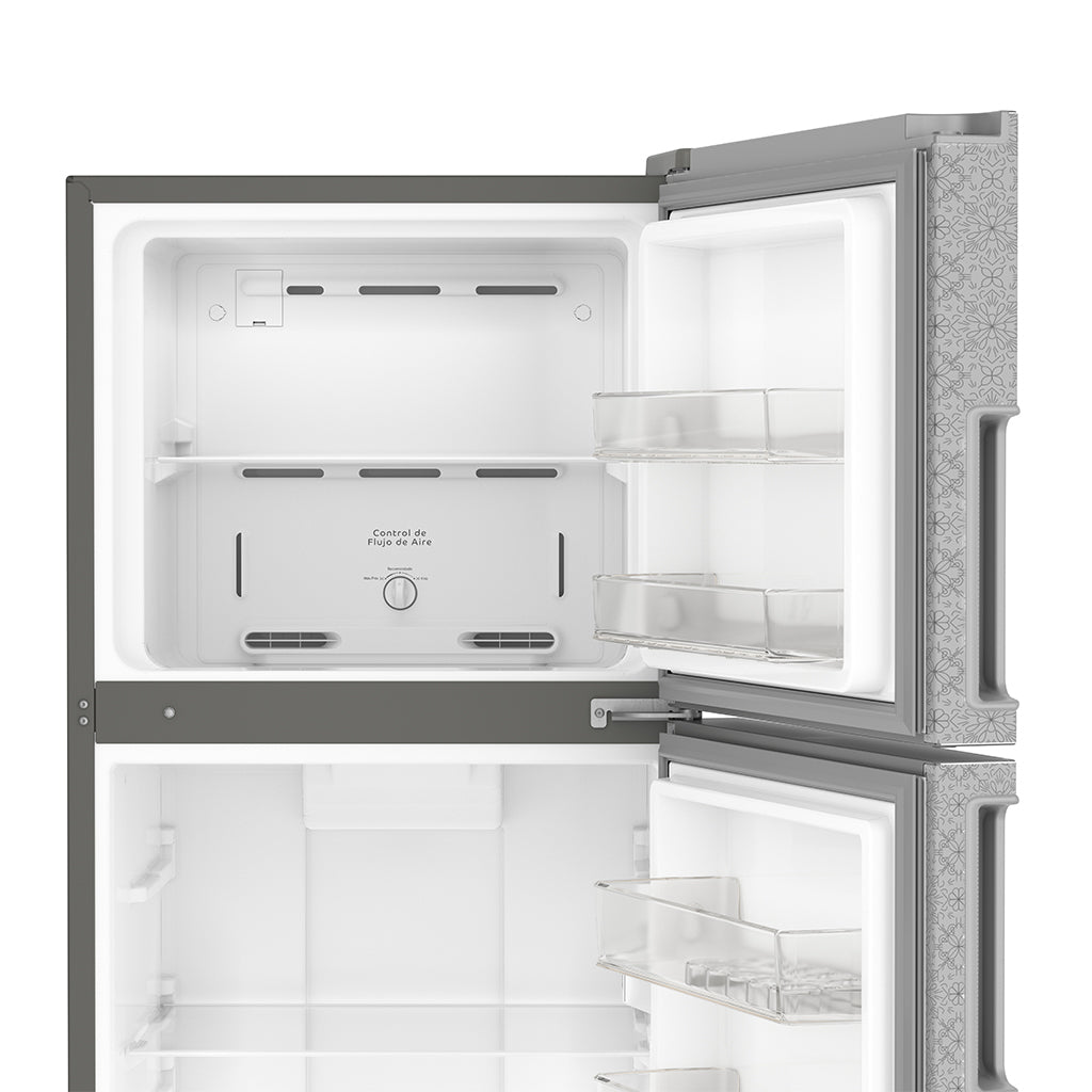 NUEVO Refrigerador de dos puertas 13 p³ en color Platino con exclusivo Decorado que combina con cualquier estilo de cocina. Tus alimentos se mantendrán siempre frescos y al alcance de tu mano; con su amplio espacio interior y la flexibilidad de sus parrillas y anaqueles. Acros Inspirado en ti.